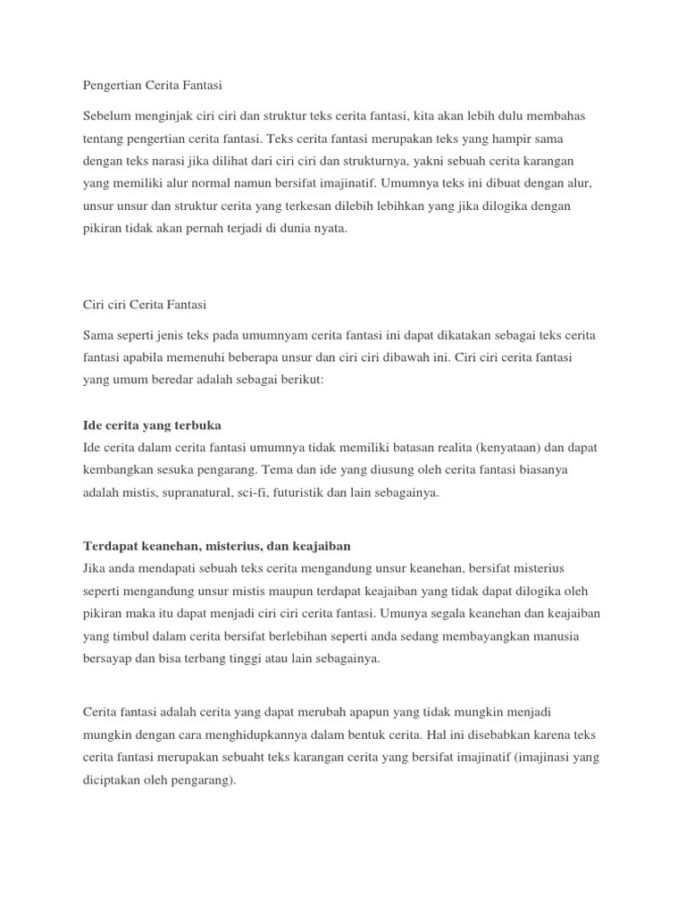 Apa itu teks cerita fantasi ? Yakni merupakan suatu konsep cerita yang bersifat fiksi yang mana alur dari ceritanya mengandung suatu unsur yang . 5 contoh cerita fantasi : Umumnya teks cerita fiksi ini akan berbentuk cerita pendek fantasi yang didalamnya memuat alur cerita yang terkesan memberikan khayalan semata. 3 contoh cerita fantasi anak singkat imajinatif.